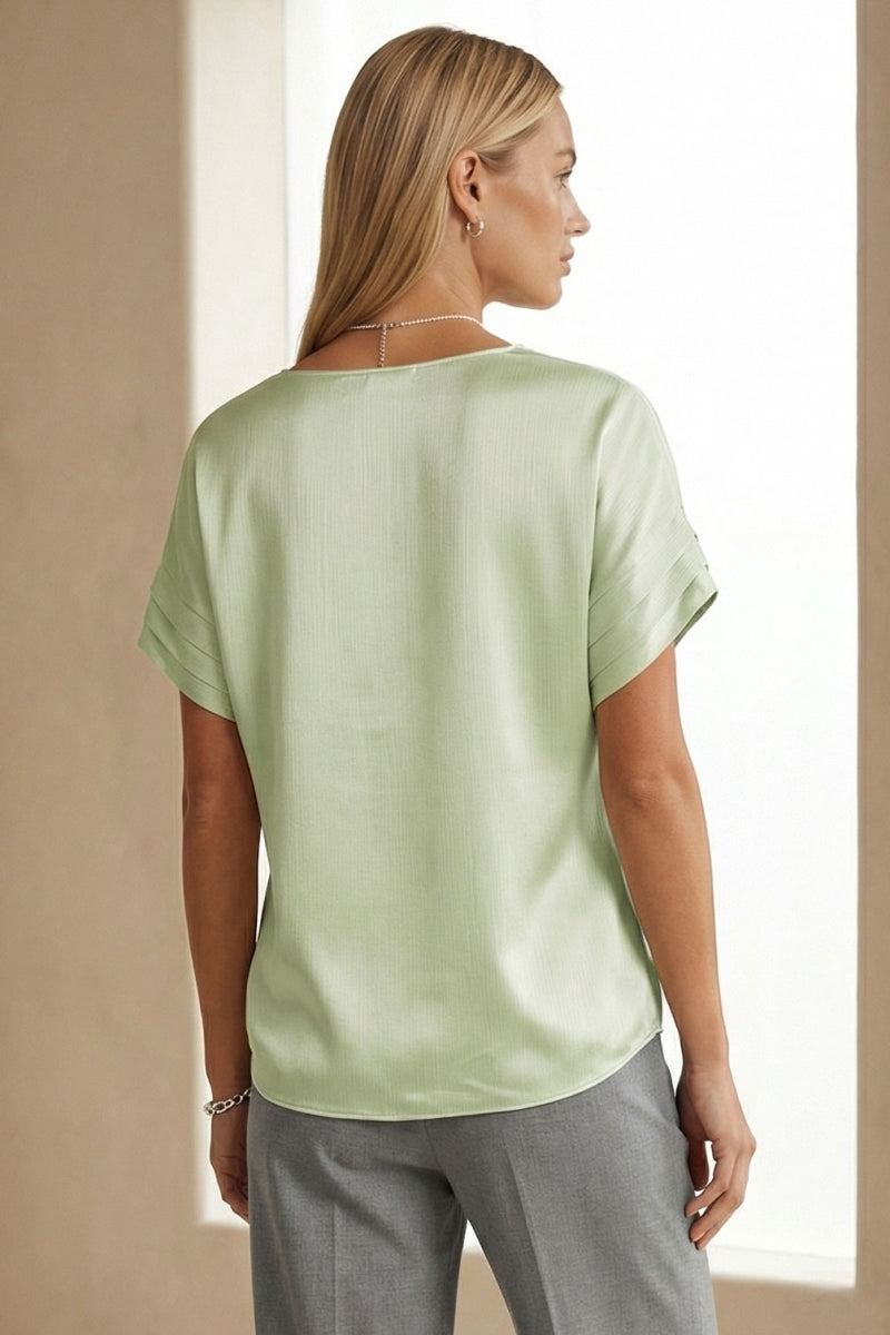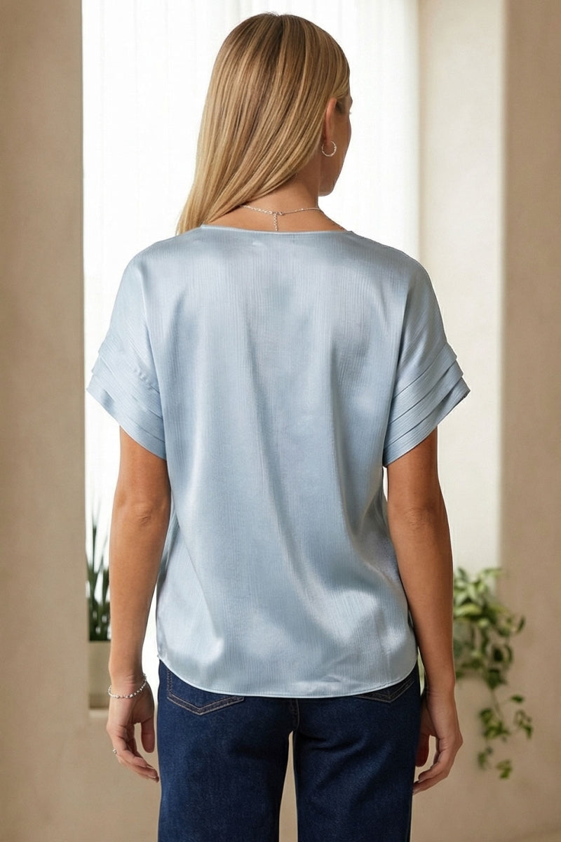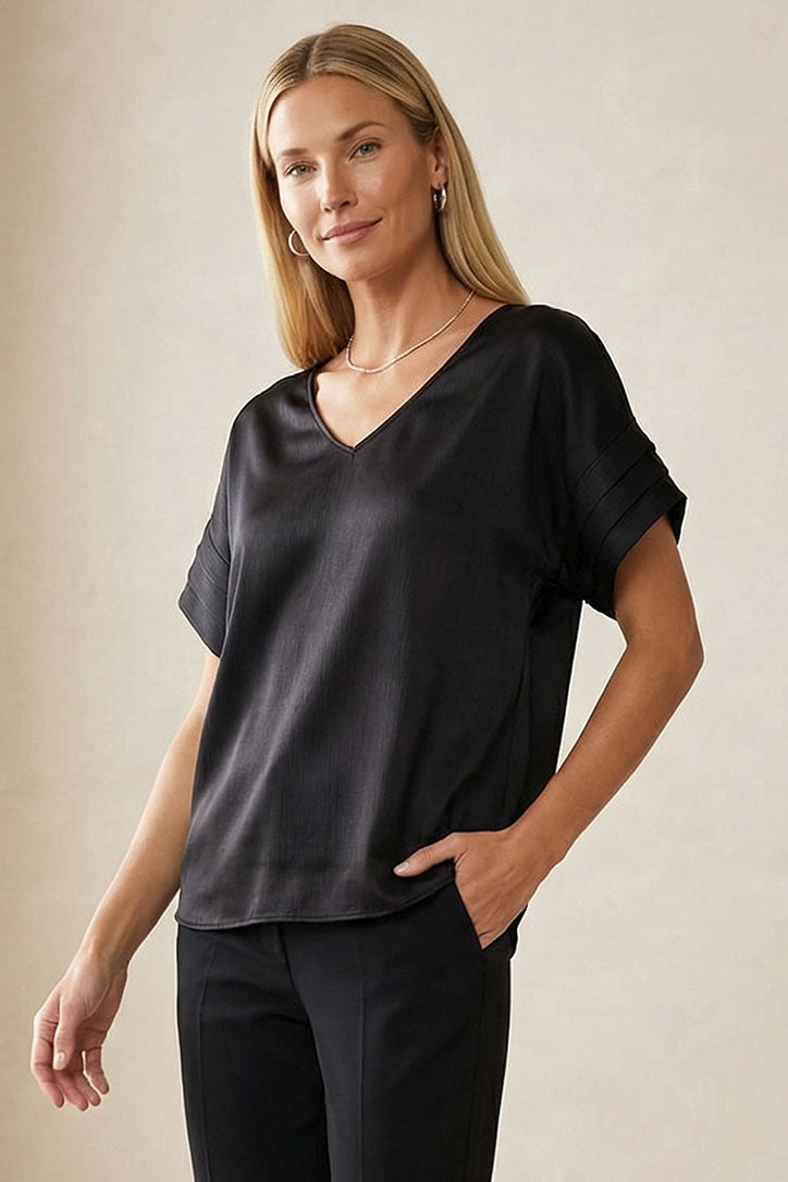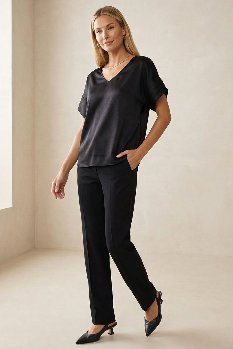 The V-Neck Blouse with Self Bands Sleeve Detail combines classic elegance with modern sophistication. Featuring a flattering V-neckline and unique self-band details on the sleeves, this blouse adds a touch of refined style to any outfit. Perfect for both casual and dressy occasions, it enhances your wardrobe with its versatile and chic design.
