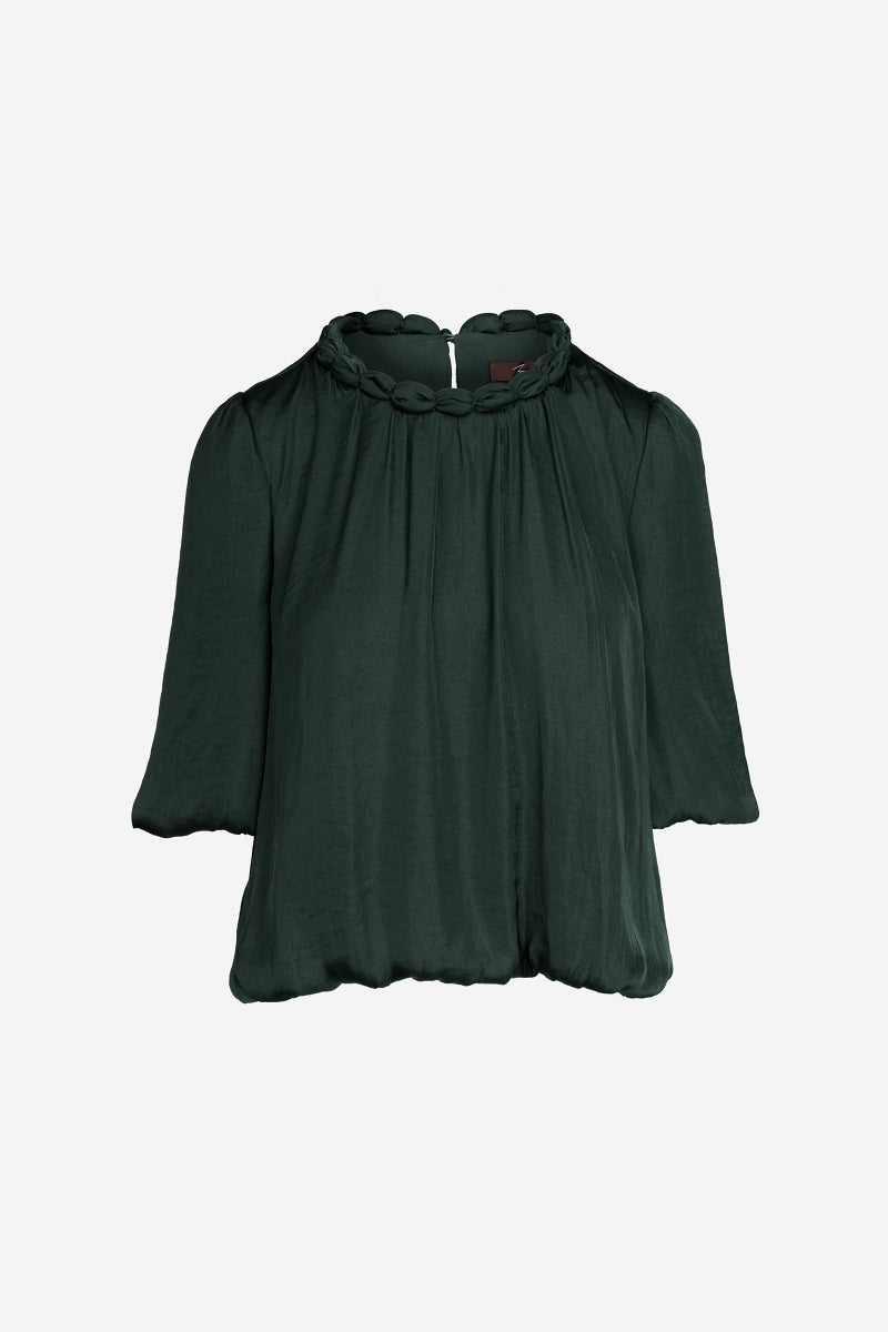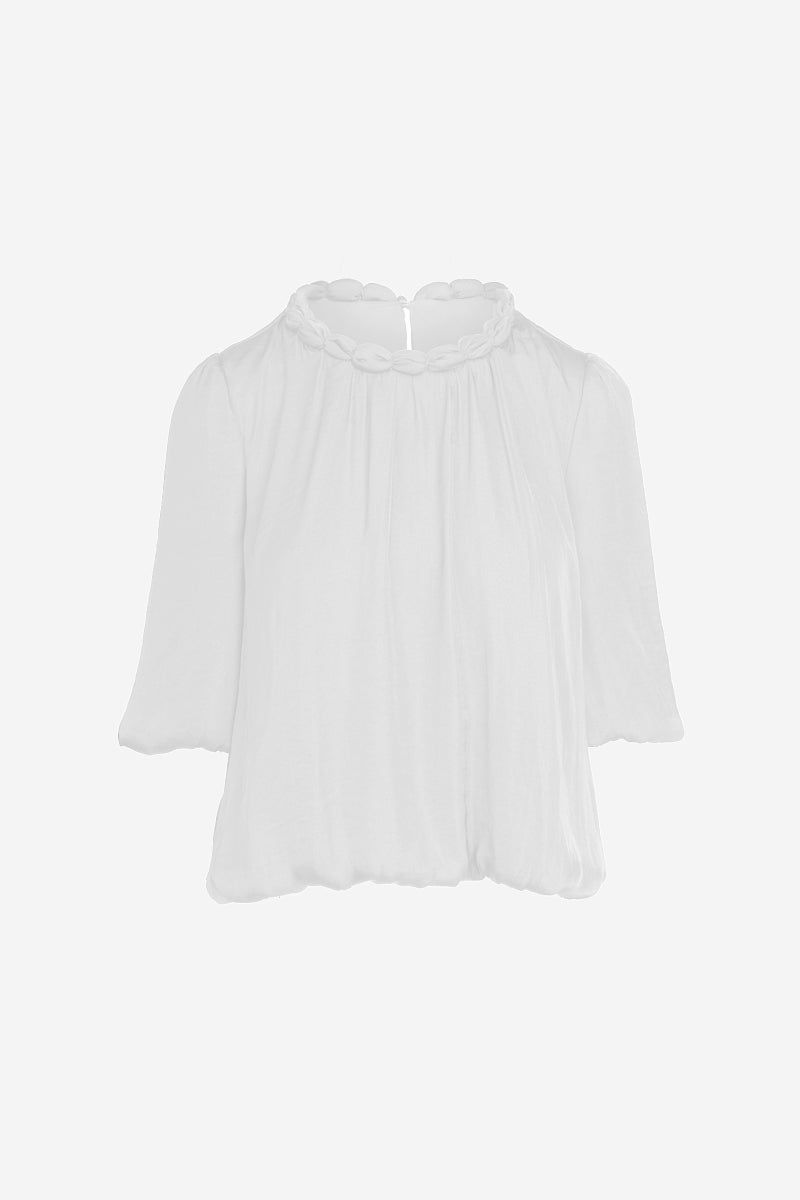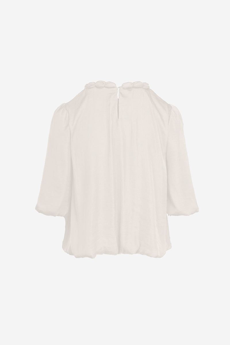 ╴½ sleeve with bubble hem and back keyhole closure for subtle dimension.
