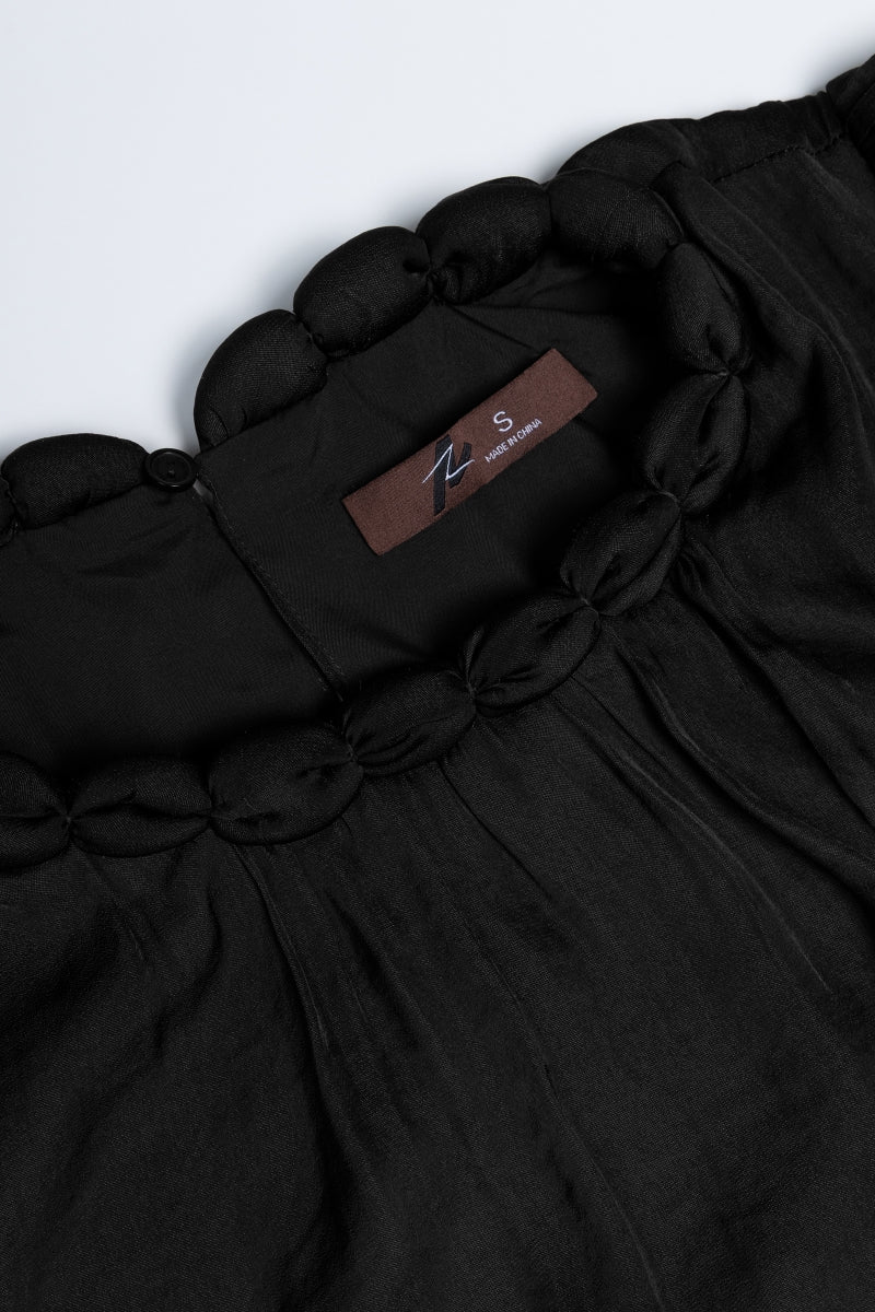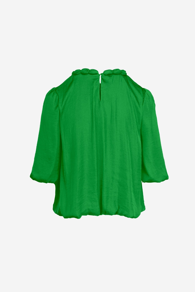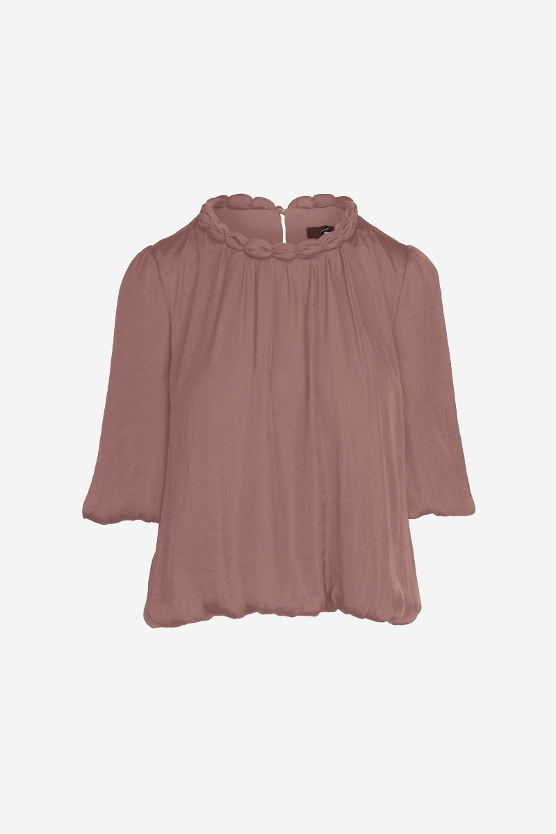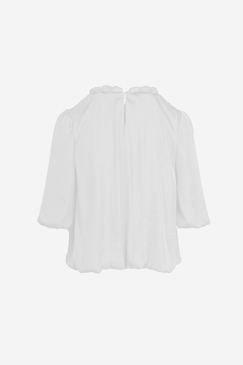 ╴½ sleeve with bubble hem and back keyhole closure for subtle dimension.