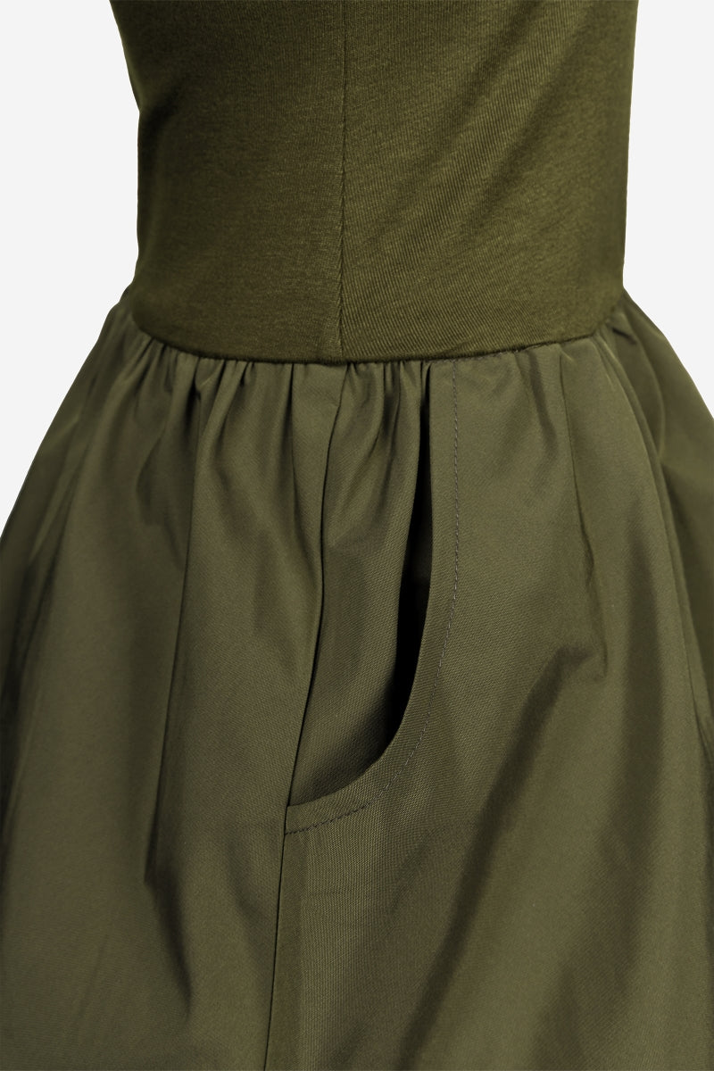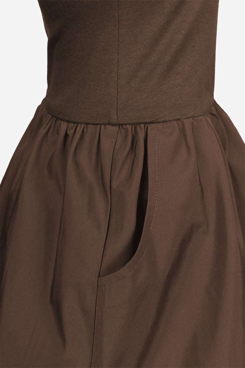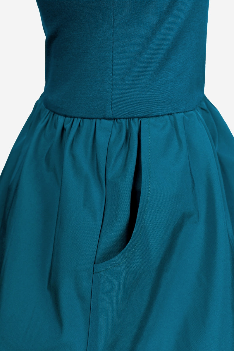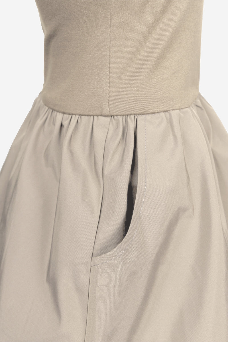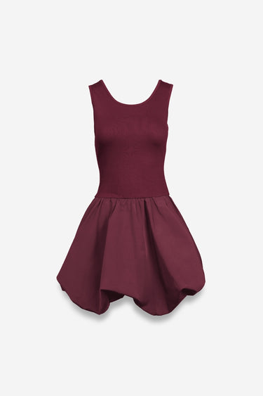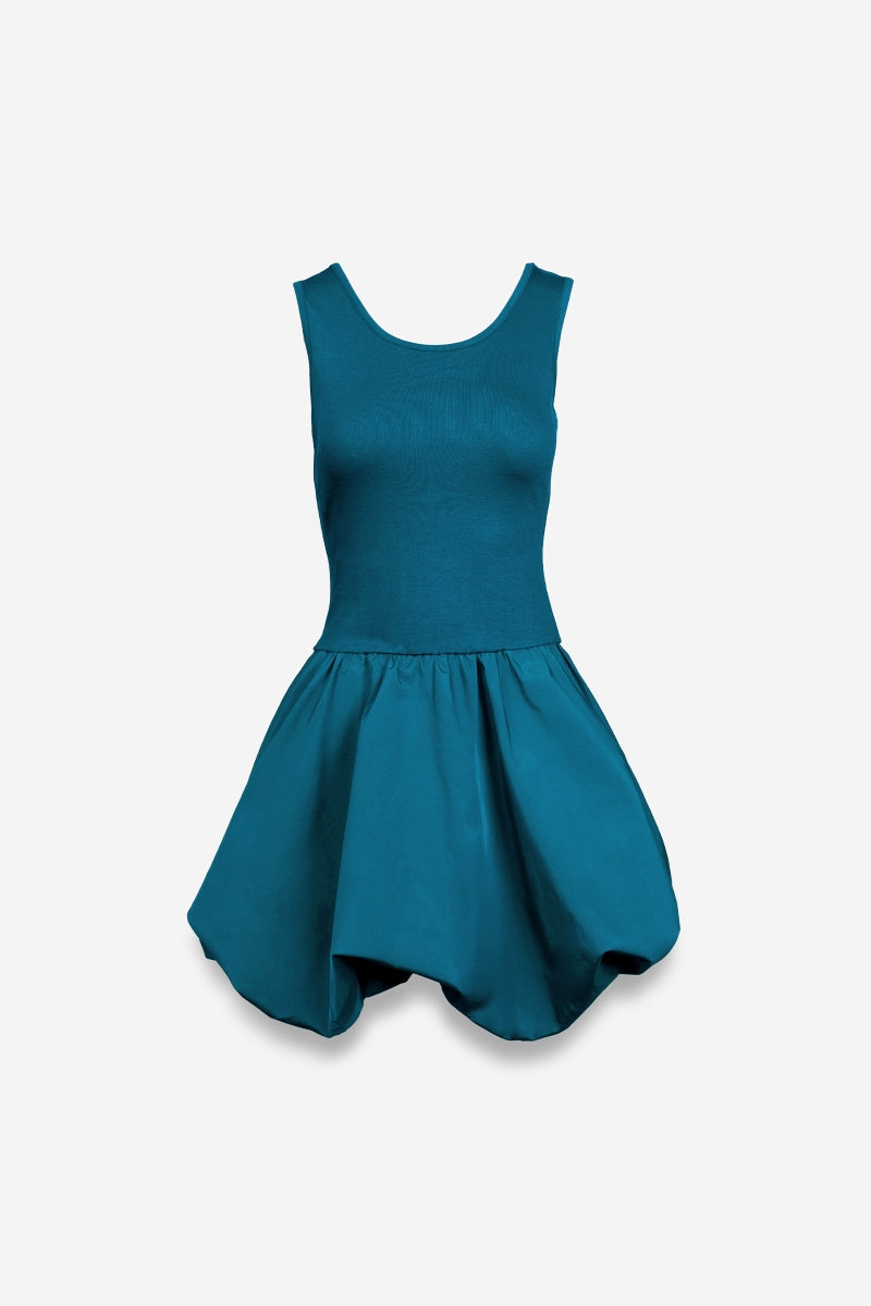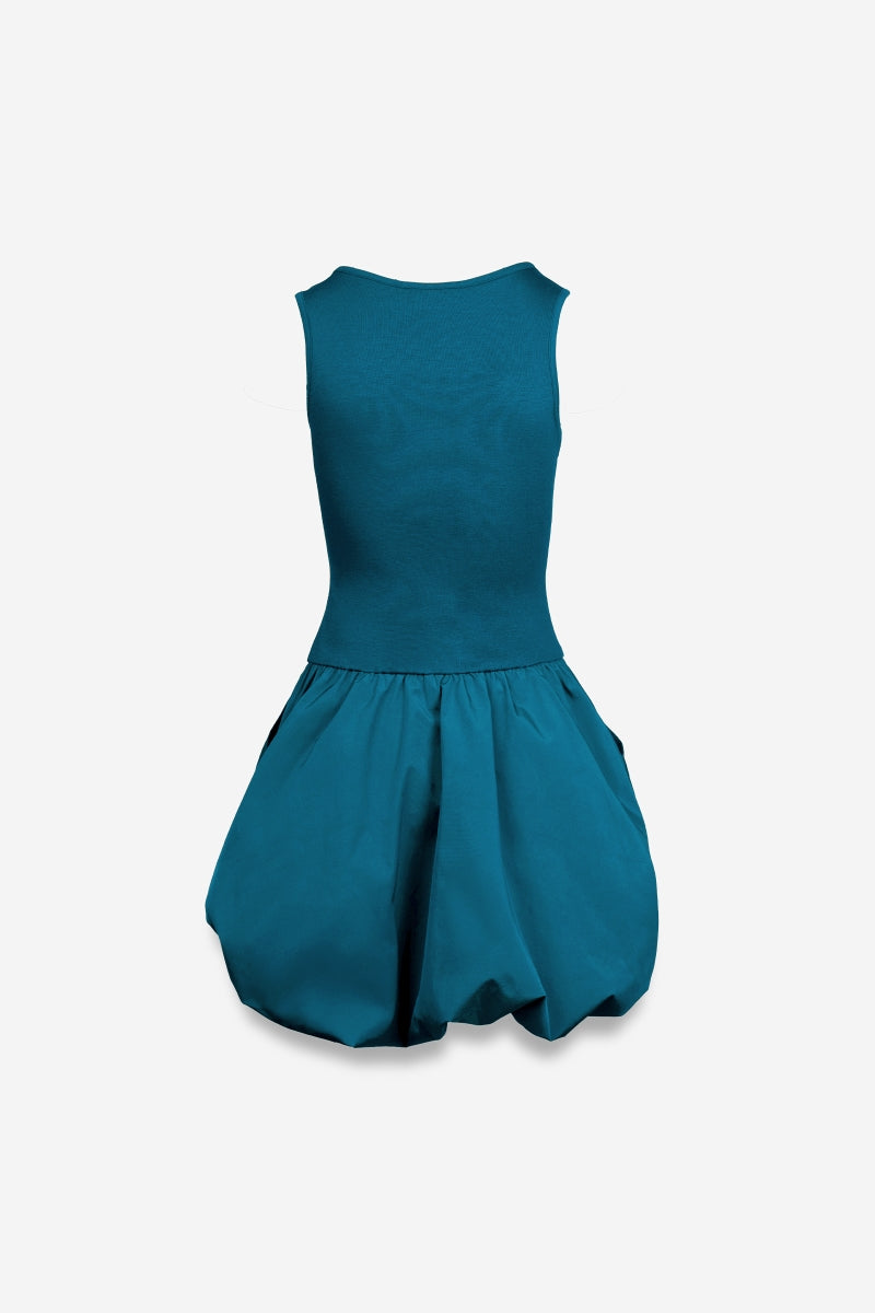 ╴Two-tone look with a fitted drop waist jersey knit top and structured woven bubble skirt